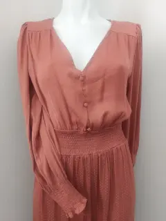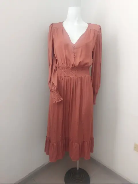 Vestido fresco manga larga, elastico en puños y cintura, corte largo poco debajo de rodilla. Color tipo rosa viejo quemado.