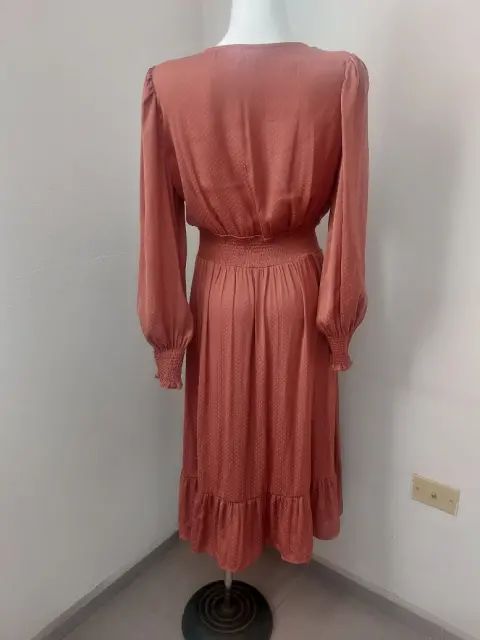 Vestido. Vestido fresco manga larga, elastico en puños y cintura, corte largo poco debajo de rodilla. Color tipo rosa viejo quemado.