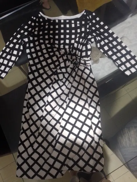 Vestido. Vestido tres cuartos cuadros negros con color beige y piensa en la cintura para moldear tu figura