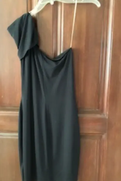 Vestido Coctel negro corto, de tirante con un hombro libre, marca Lounge, talla chica, con detalle plisado al frente