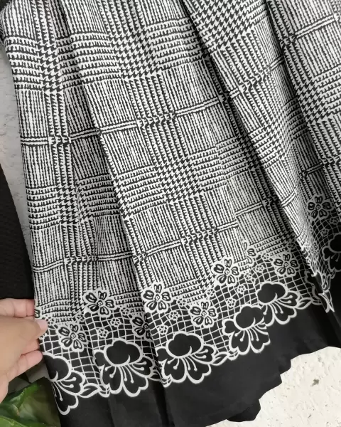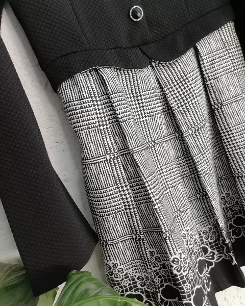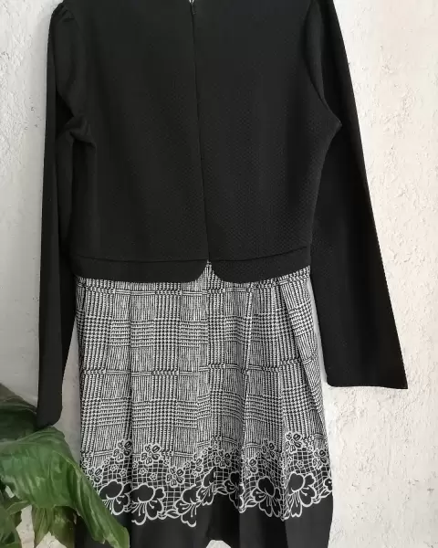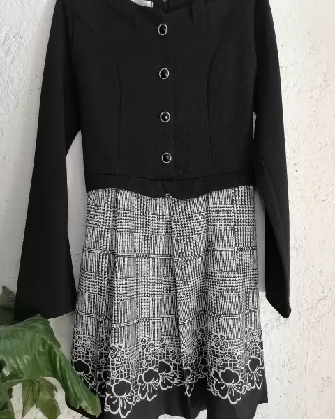 Hermoso vestido seminuevo, negro con estampado de cuadros y floral.Botones estilo vintage.Simula ser dos piezas.En buen estado sin ningun detalle.Talla: 36Cierre en la parte del saco por atrás, la tela de la parte superior estira un poco.No se transparenta.MedidasLargo: 90 cmCintura: 90 cmHombro: 40 cmManga: 63 cmPecho: 100 cmFalda tableada, corte A