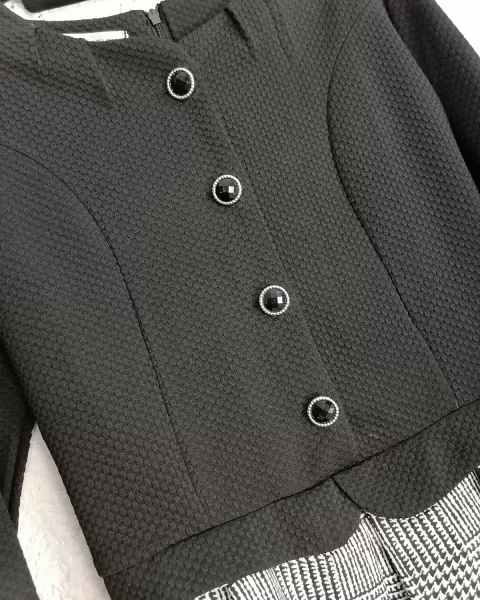Vestido 2 en 1 casual Negro. Hermoso vestido seminuevo, negro con estampado de cuadros y floral.Botones estilo vintage.Simula ser dos piezas.En buen estado sin ningun detalle.Talla: 36Cierre en la parte del saco por atrás, la tela de la parte superior estira un poco.No se transparenta.MedidasLargo: 90 cmCintura: 90 cmHombro: 40 cmManga: 63 cmPecho: 100 cmFalda tableada, corte A