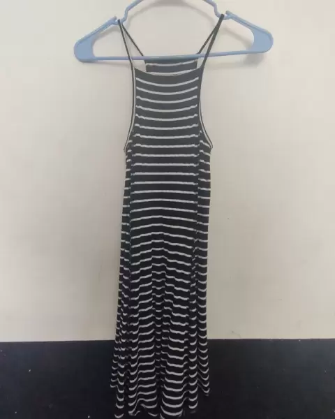 Vestido. Vestido casual, corto de tirantes, con franjas delgadas color blanco y negro. Se ajusta a la figura