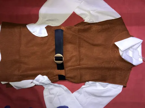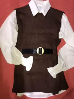 Vestido 3 piezas. Vestido casual corto Blusa, chaleco y cinturónColor café y ladrillo