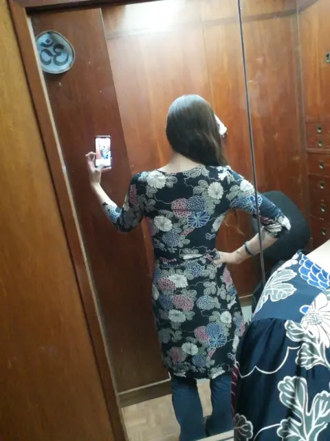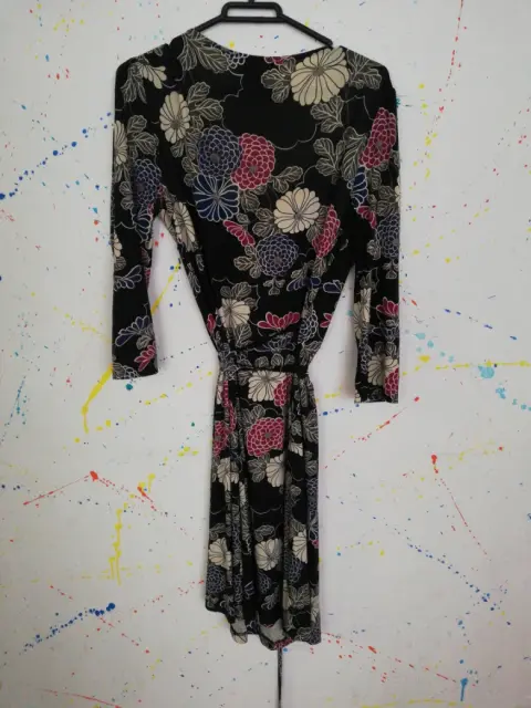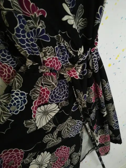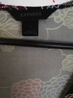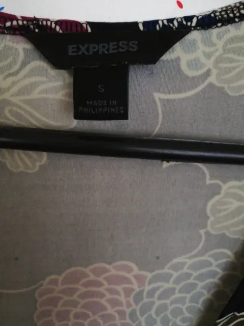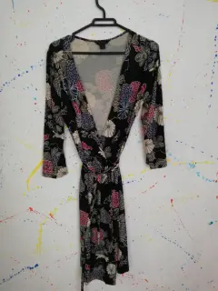 Vestido marca Express talla chica aunque tambien puede ser mediana, viene amplio.Color negro con flores en azul, guinda y blanco. Tela 95% poliester 5% elasteno