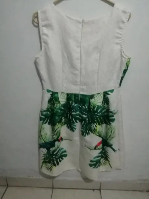 Vestido balnco con estampado hojas verdes, sin manga, largo de 100cms talla extrangrande, busto 100ms contura 90cm