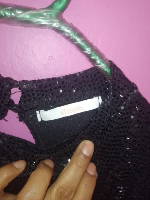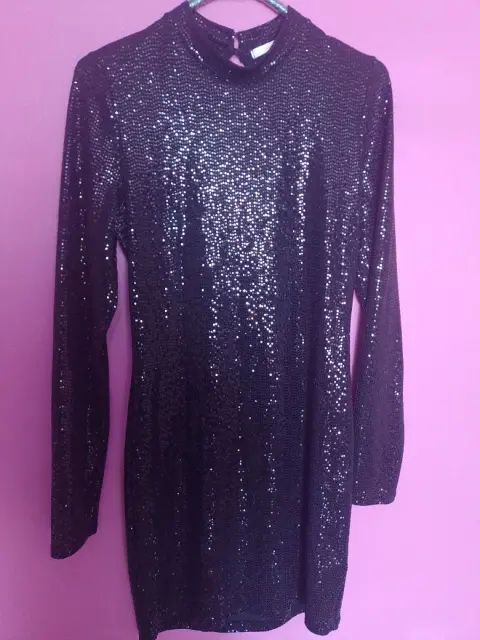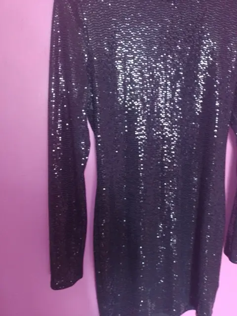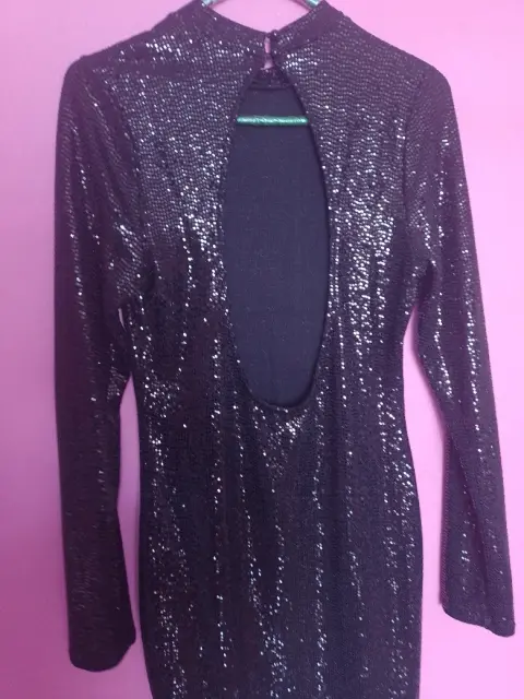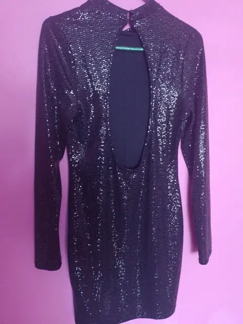 Vestido corto en color negro con lentejuela,manga larga,cuello redondo con escote en la espalda,perfecto para una fiesta en la noche,no tiene ningún defecto