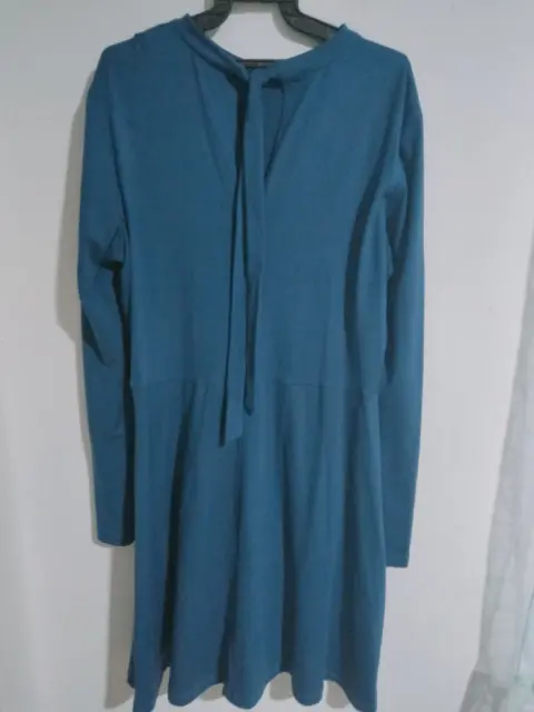 Vestido azul casual, talla chica, es pegado del pecho, holgado de abajo, una cinta en el cuello que le da un toque casual, manga larga, queda arriba de la rodilla.