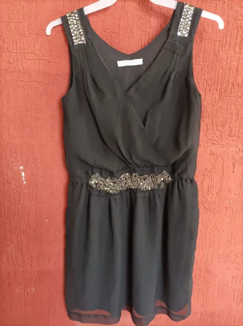 Vestido negro, con fondo, 100% poliéster, adorno a la altura de la cintura.