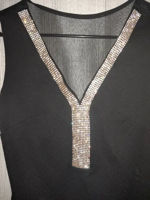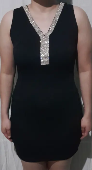 Vestido elegante, color negro, con transparencia en la parte trasera