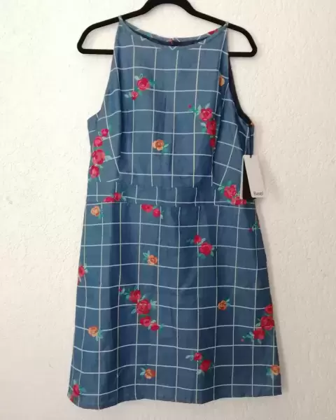 Producto nuevo. Vestido marca Basel con estampado a cuadros y flores bordadas, cierre invisible, hombros descubiertos y tirante delgado. Talla 36. Forro 100% poliéster, vestido 40% algodón, 60% poliéster.Medidas: ancho busto 52 cm, ancho cintura 45 cm, cadera 55 cm, largo 95 cm.