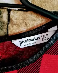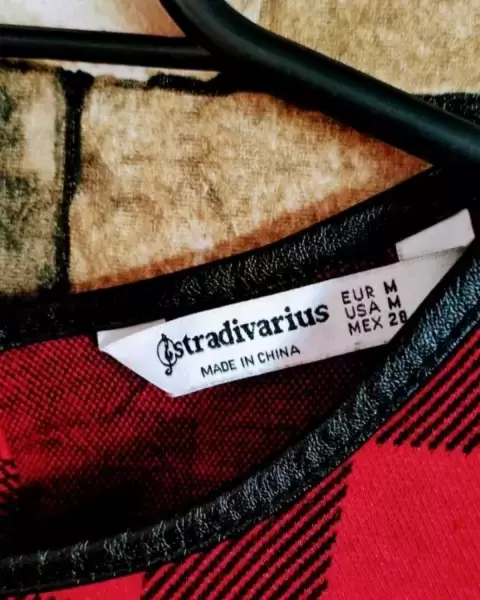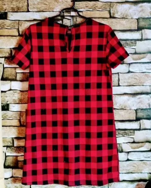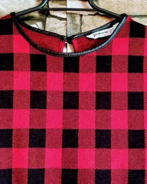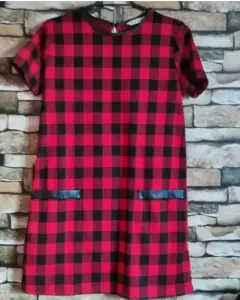 Vestido a cuadros rojo y negro. Ningún detalle, aplicación de vinipiel en cuello y bolsas.Hombros 39 cmPecho 48 xmLargo 82 cm.