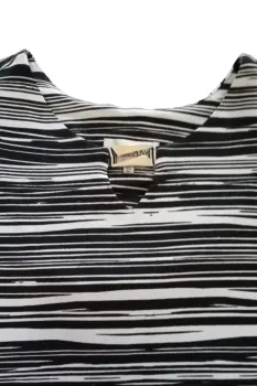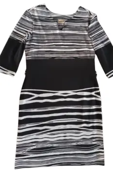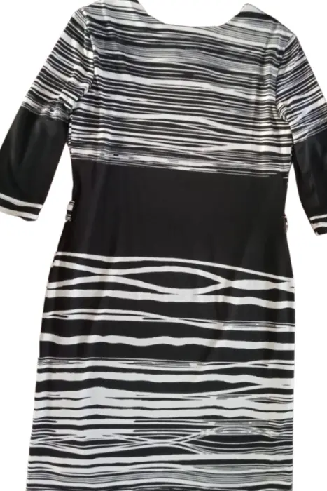 vestido a rayas. Talla 32, se pega al cuerpo, esta hecho de poliéster y elastano, se uso solo una vez en excelentes condiciones, tiene forro de color negro, manga 3 cuartos, contorno busto 93 cm, es arriba de la rodilla. adorno metálico en el pecho.
