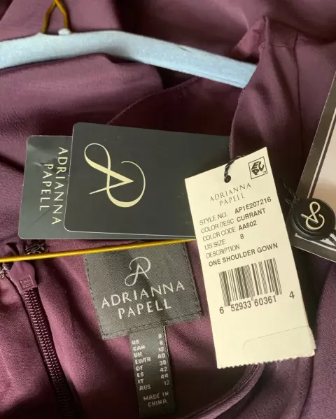 Vestido Adrianna Papell. Hermoso vestido largo de fiesta elegante, color uva, talla 8 con un hombro descubierto, largo hasta el tobillo. Medidas: Busto 91cm. Cintura 74cm. Cadera 100