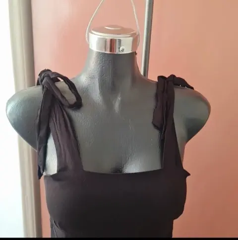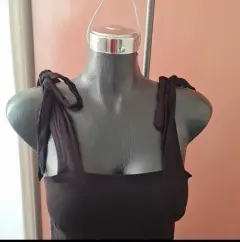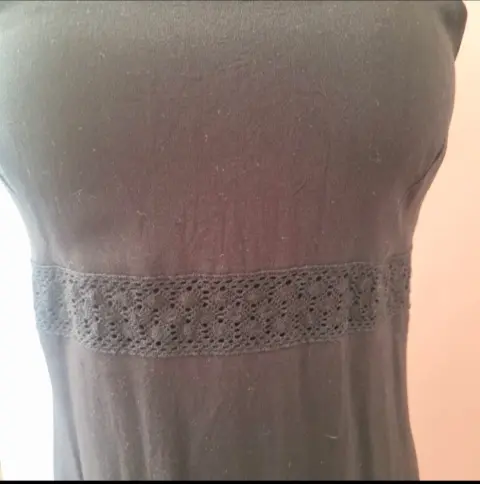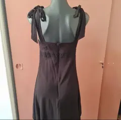 LigeroFrescoTirantes de listón ajustas y haces moñoCon fondo abajo para evitar transparenciasSin detallesPrácticamente nuevoCon cierre y broche en la espaldaCorte recto y amplioAxilas 39cmLargo 82cm