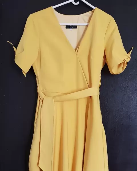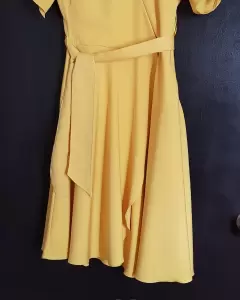 Vestido amarillo. Vestido formla o casual de poliéster, con detalles en las mangas (se puede amarrar) y olanes ligeros en la parte de abajo. Tiene un cinturón de la misma tela para enmarcar la cintura. La caída de la tela es muy bonita y un poco pesada.