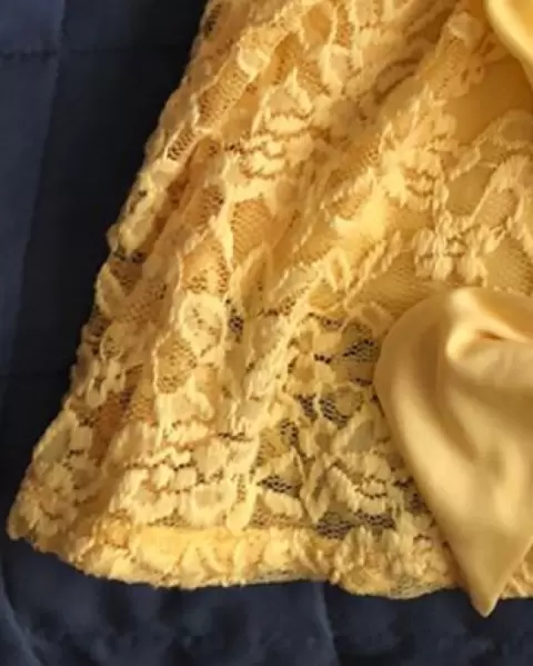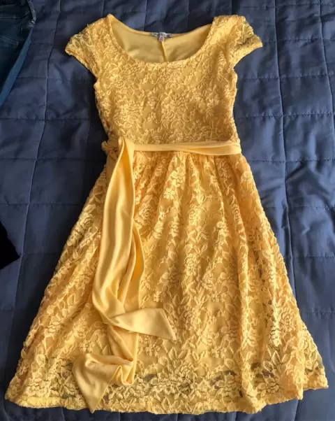 Hermoso vestido de encaje de flores amarillo en excelentes condiciones con listón para moño (se puede retirar). Estilo cocktail, largo aprox a las rodillas.