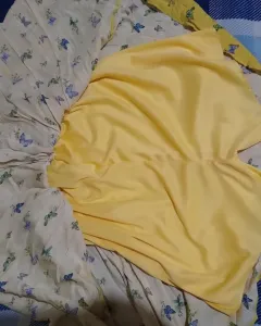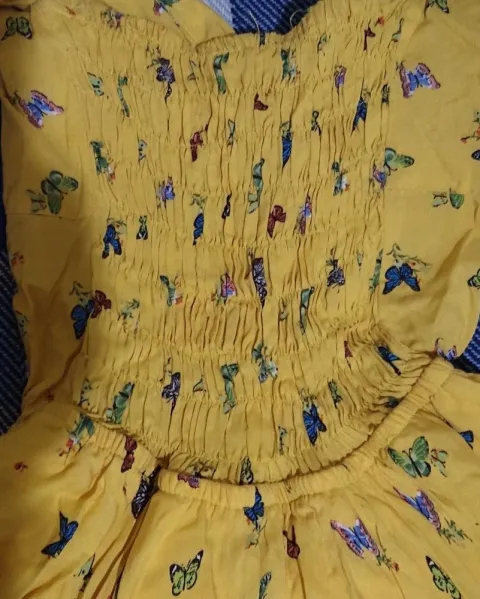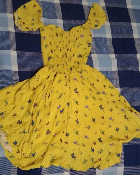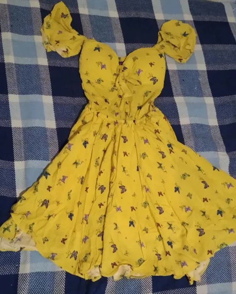 Vestido amarillo con estampado de mariposas, en la parte del busto tiene copas y un moñito de adorno, en la parte de la espalda tiene resorte, mangas pequeñas, tiene fondo tipo short