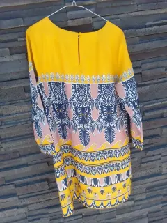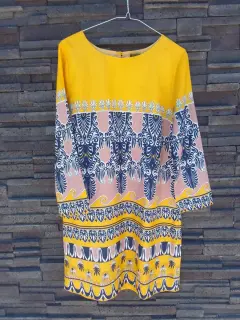 Vestido formal, ligero de vestir color mostaza. . DIbujos Estilo Otomi. Poliester