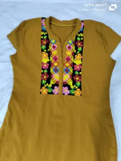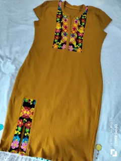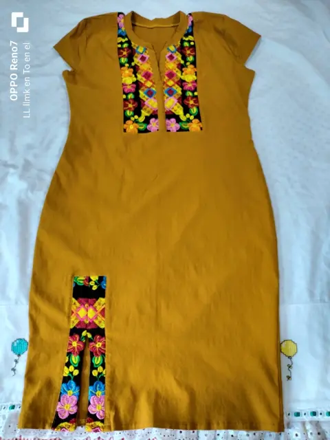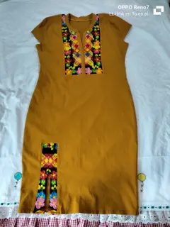 Vestido Artesanal con bordado Istmeño. Tela strech, color amarillo mostazaMedidas:Busto 48 a 50 CM x2Cintura 38 a 40 cm x2Cadera 48 a 50 CM x2Largo 96 CMVestido elaborado en Oaxaca...Si te gusta ajustado, puede quedar a una talla más...