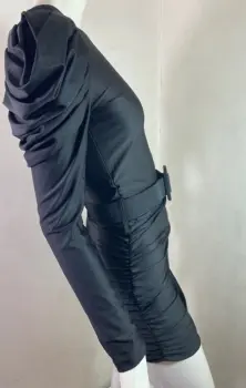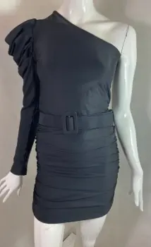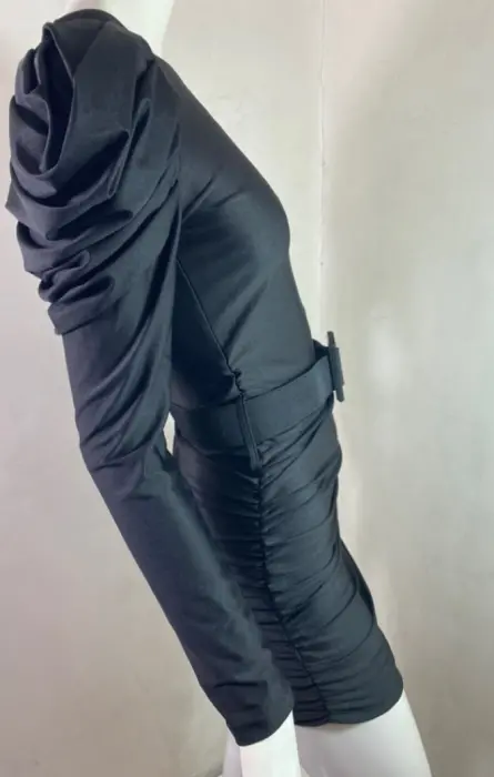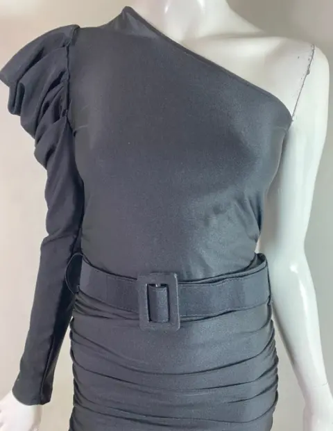Vestido asimétrico negro. Vestido en licra satinada de un hombro con una manga abullonada con cinturón de la misma tela, es recto y corto la talla es única y queda a chico y mediano