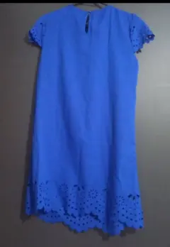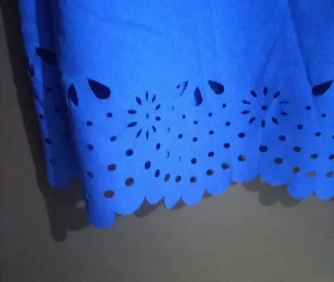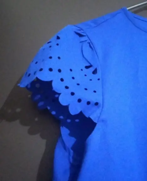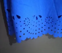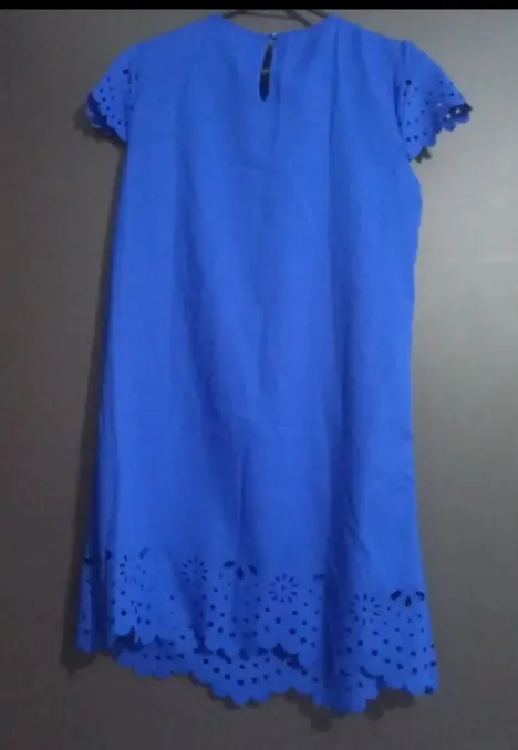 Bonito veztido casual azul, tela fresca, con detalles de corte son laser en mangas y falda