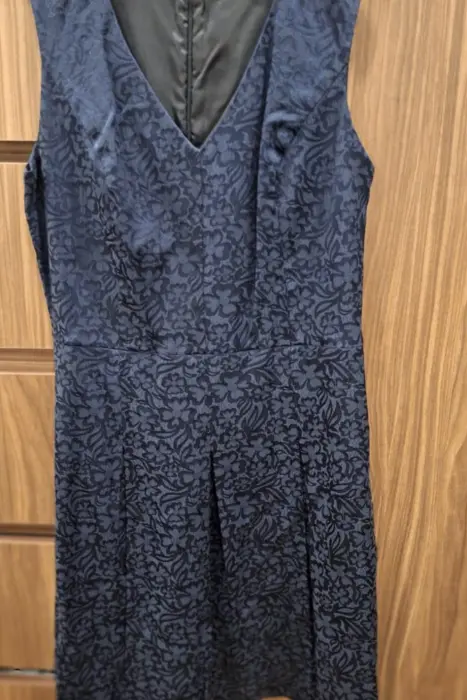 Vestido Azul. Vestido Azul drapeado sizado cuello V, tablones en la falda y bolsas
