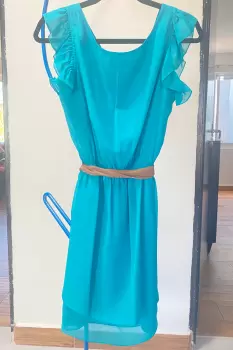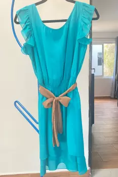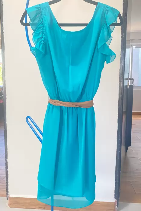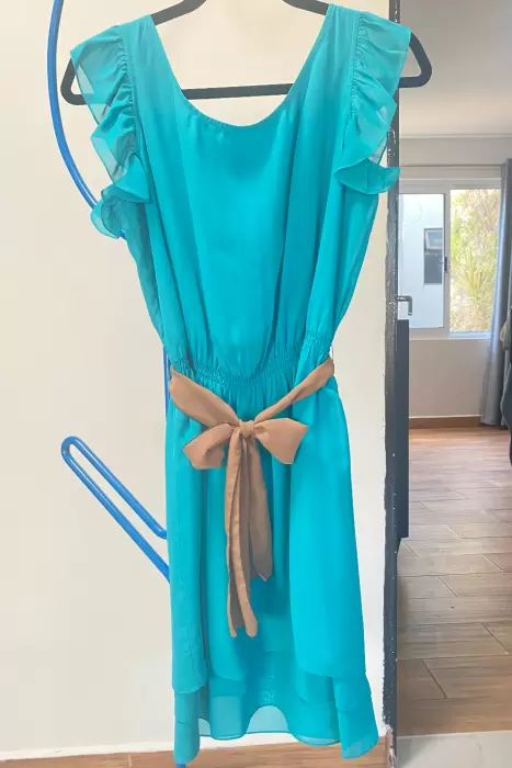 Vestido Azul aqua. Vestido fluido con cintura ceñida y cinturón incluido, fresco y horma super lindo al cuerpo, tiene 2 olanes en la parte más baja de la falda, no tiene ningún detalle. 100% poliéster
