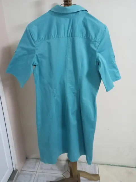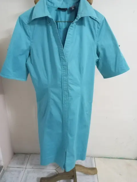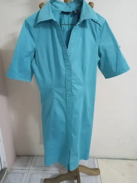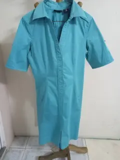 Vestido, de manga corta azul celeste, llega arriba de la rodilla con una aberturade frente, tiene botones que no se notan, cuello VIdeal para vestir casual o con zapatillas, excelente estado.