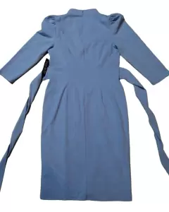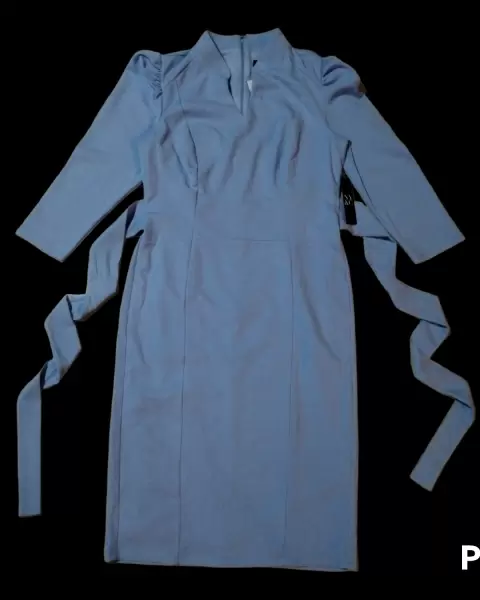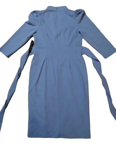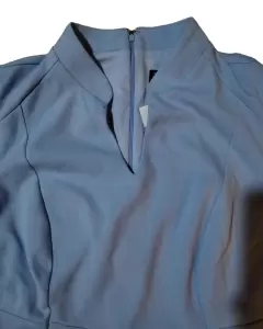 Vestido azul claro mangas 3/4. Hermoso vestido corte recto con mangas 3/4. Tiene cintas ajustadoras en la cintura, si escote es muy elegante, tiene cierre invisible por la espalda, la tela es gruesa no se transparenta