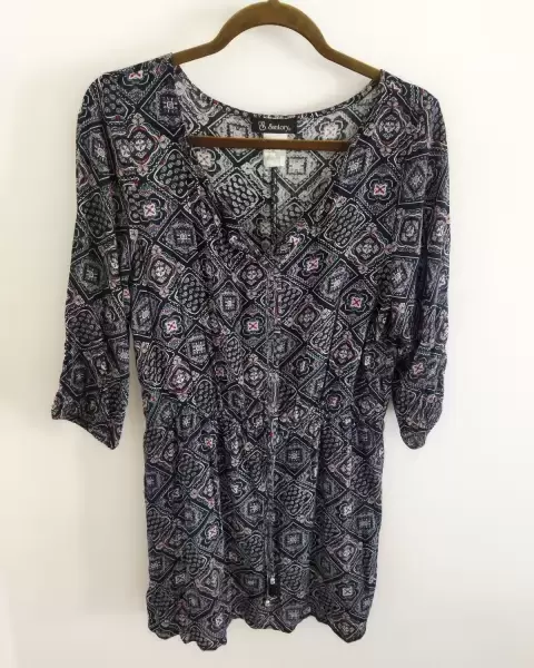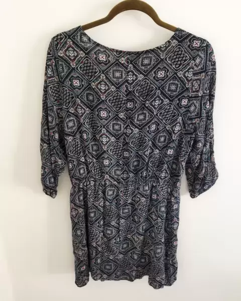 Vestido azul estampado con manga 3/4. Hermoso vestido con estampado en colores azul marino,blanco y rojo.Trae forro y es muy fresco.Queda bien a talla M♻️ Envío en empaque reciclable⬇️🤩 Usa mi código para obtener $100 en tu primer compra juliette441507B42