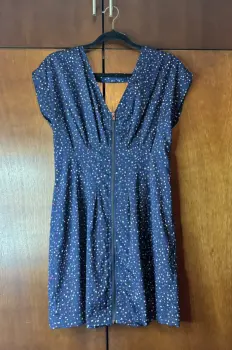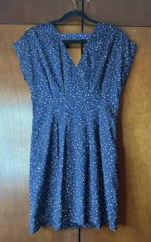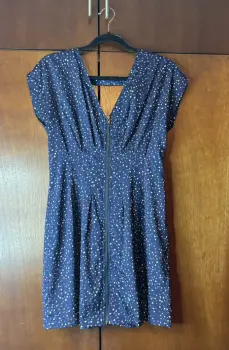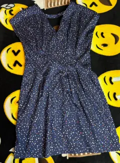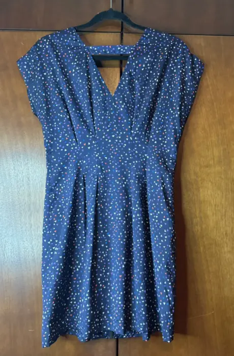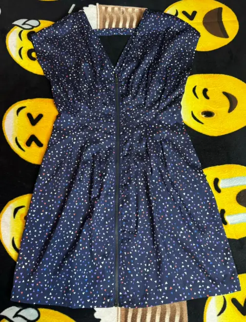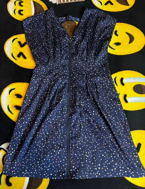 Vestido azul con triangulos de colores, cierre enfrente, cuello V, manga corta, talla chica, sin detalles.