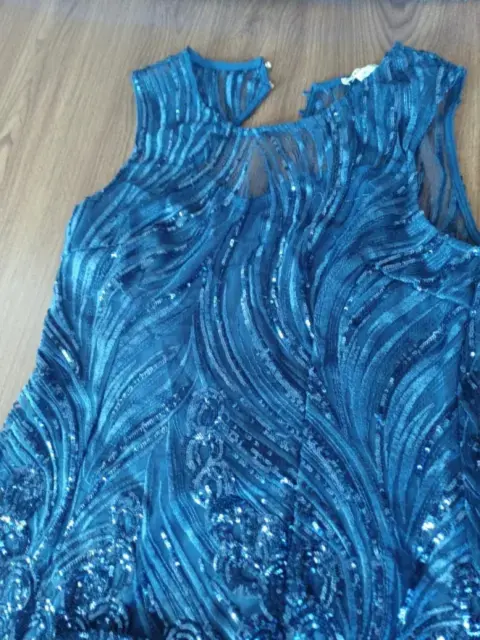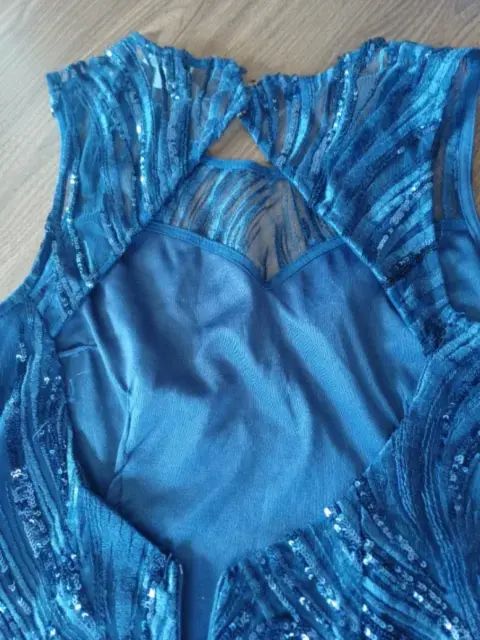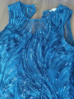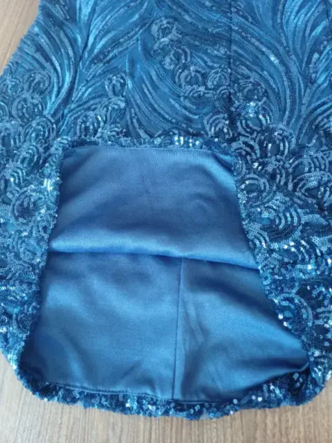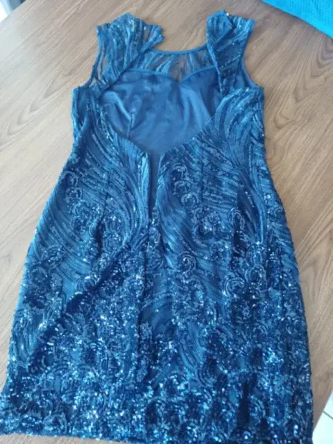 Vestido azul marino, de coctel, forro, con lentejuelas, espalda descubierta, corto, talla M, hermoso, impecable, ajustado al cuerpo