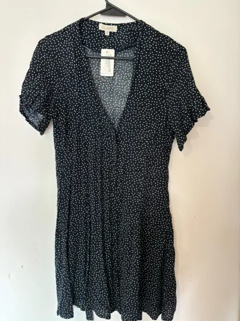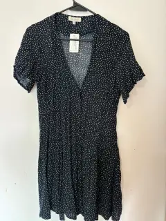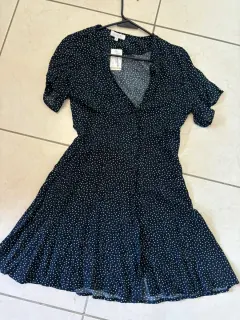 Vestido azul marino con bolitas blancas. Vestido coqueto y fresco color azul marino con puntos blancos, hace muy bonita forma. Es talla Mediana pero viene reducido. Medidas de axila a axila 41 cm cintura 35 cm largo 80 cm