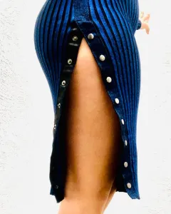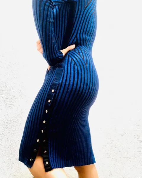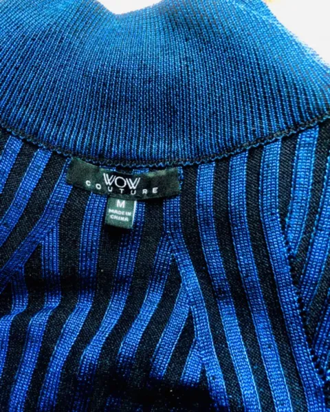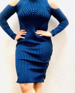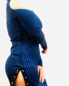 Vestido azul marino con negro. Vestido talla M , marca Wow Couture, tiene estoperoles en las piernas.Medidas: axila a axila 43 cm, hombro a hombro 35 cm, largo 108 cm. Todo se envía limpio y desinfectado