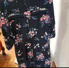 Vestido azul marino floreado. Es un vestido en excelente condiciones, flores rosas y detalles azules y un tipo encanje o tejido al frente y en la espalda, semi nuevo. Manga larga.