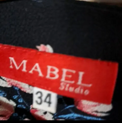 Es un vestido en excelente condiciones, flores rosas y detalles azules y un tipo encanje o tejido al frente y en la espalda, semi nuevo. Manga larga.