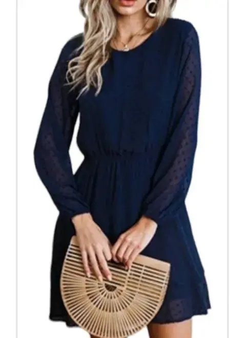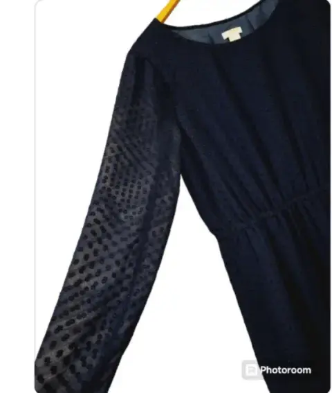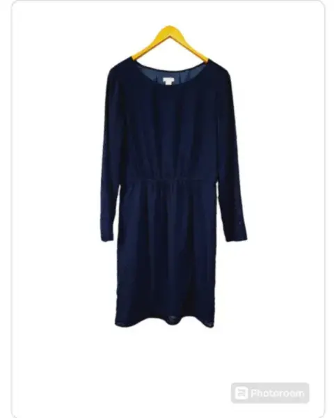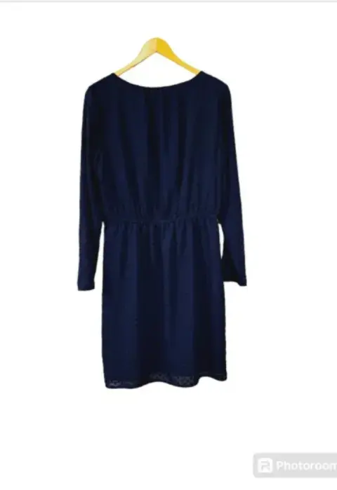 Vestido Azul Marino, manga larga transparente, con forro, falda terminación asimétrica por enfrente, talla S, medidas de axila a axila 47cm, Cintura 37cm con resorte estira hasta 47cm, Largo 91cm