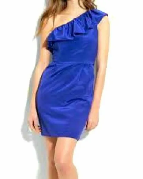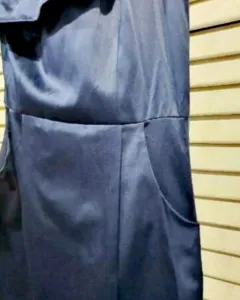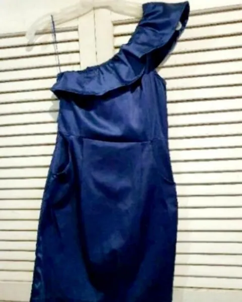 Bello vestido azul marino de tela satinada, de un solo hombro, con bolsillos a los lados, muy fresco y lindo. en buen estado!!