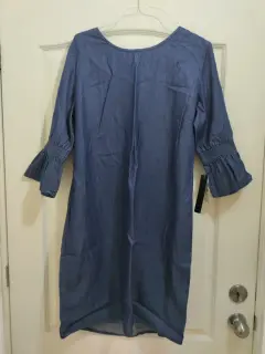 Ventó vestido tipo mezclilla delgado, color azul, manga 3/4 térmicos acampando?, cuello redondo, sencillo pero bonito. Nuevo marca LIEB, talla XG, comprado en Liverpool.