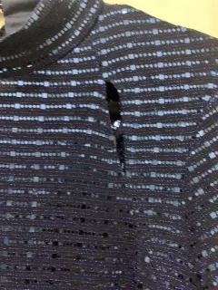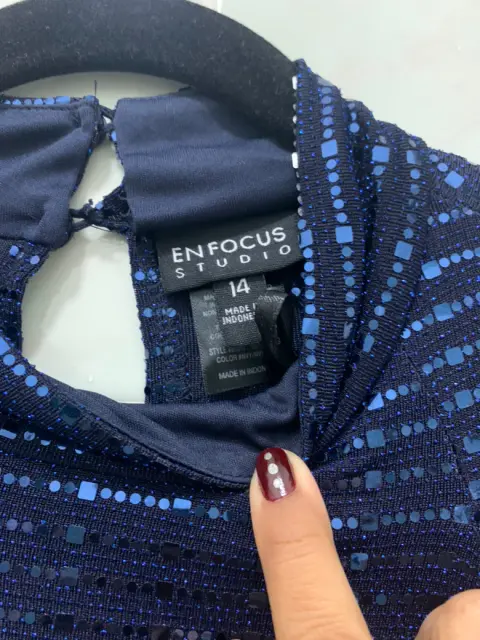 Vestido para fiesta, manga larga, cuello alto, con pequeñas aberturas en los costados del pecho y espalda. La tela estira y no se transparenta ni pica.Medidas/ busto: 46 cm, cintura: 41 cm, largo: 1.06 m.