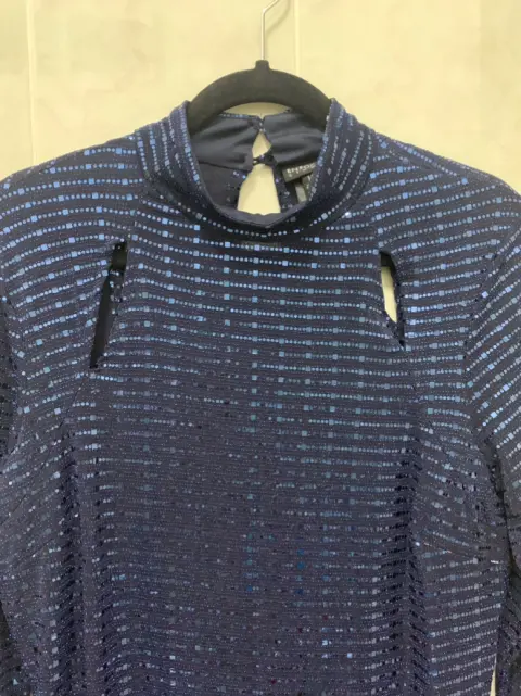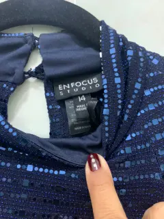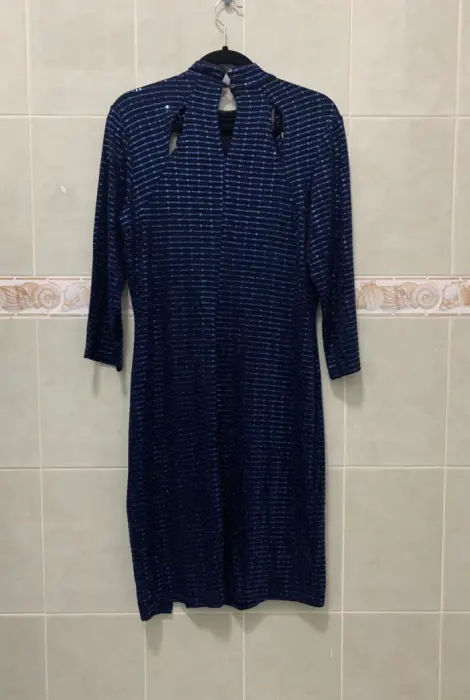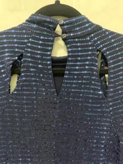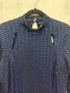 Vestido azul para fiesta. Vestido para fiesta, manga larga, cuello alto, con pequeñas aberturas en los costados del pecho y espalda. La tela estira y no se transparenta ni pica.Medidas/ busto: 46 cm, cintura: 41 cm, largo: 1.06 m.