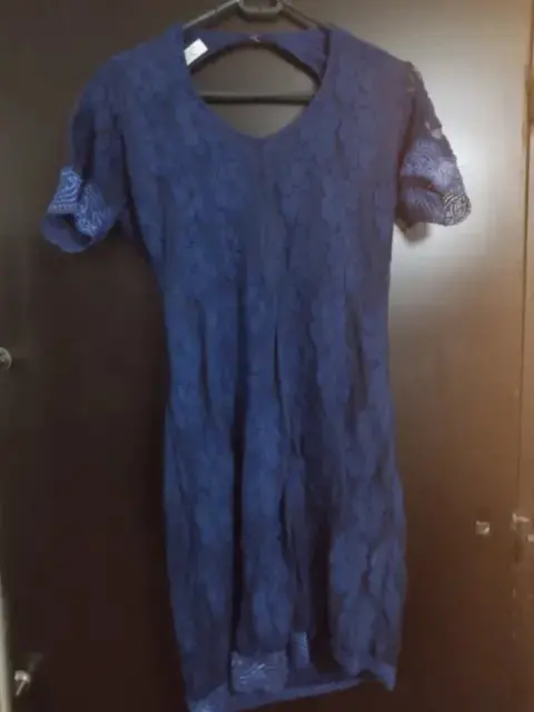 Vestido azul suelto. Vestido sin cierre. Con botón en espalda se puede utilizar un cinturón para marcar cintura ..cuenta con botón nuevo en bolsita