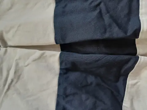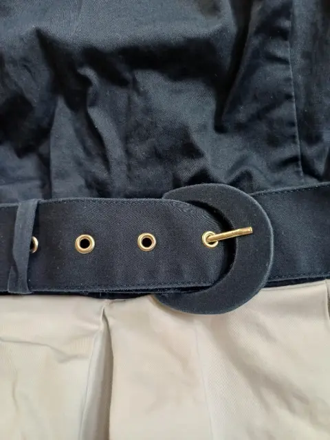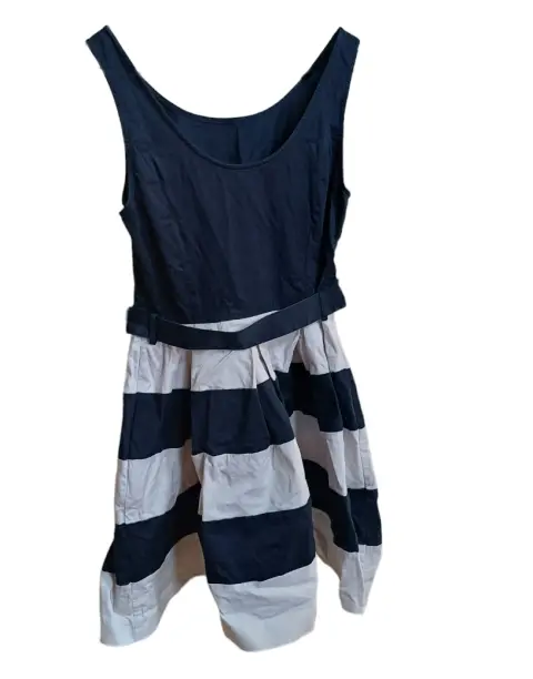 Vestido color azul marino, sin mangas, cuello redondo, con rayas gruesas horizontales color azul marino y blanca en la parte de la falda, con cinturón color azul, completamente nuevo, talla 6.