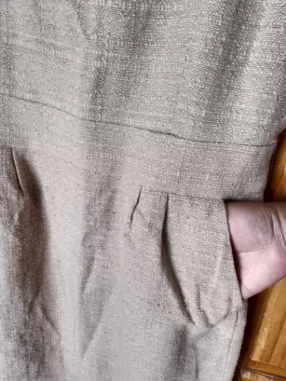 Vestido recto cuello cerrado con bolsos laterales y cierre en la parte de atrás.La tela es gruesa y trae forro,No cuenta con detalles que afecten si funcionalidad.Totalmente nuevo