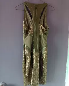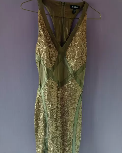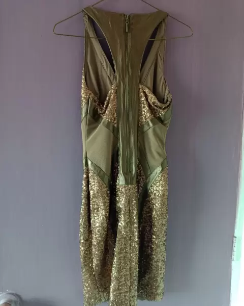 Vestido marca bebe para fiesta elaborado en piel y lentejuela doradaTalla xs