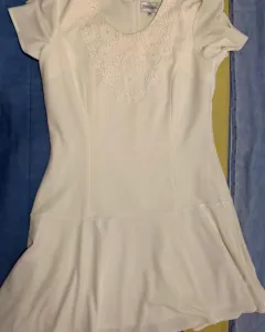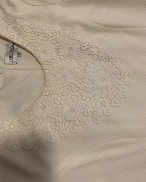Vestido beige corte recto hasta la cadera, falda semicircular, con bordado en el escote y cierre trasero. Tiene forro pero es muy fresco, no se transparenta.