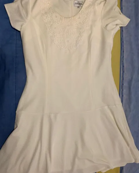Vestido beige. Vestido beige corte recto hasta la cadera, falda semicircular, con bordado en el escote y cierre trasero. Tiene forro pero es muy fresco, no se transparenta.