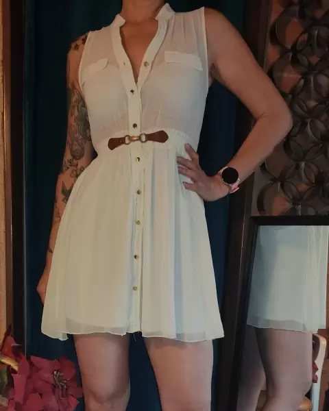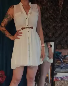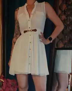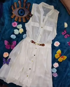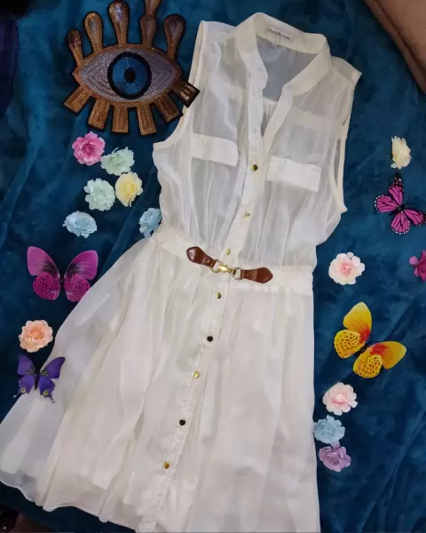 Hermosísimo vestido en collr beige o cremita, talla chica, acinturado, tela fresca, de la parte de la falda no se transparenta ya que tiene fondo incuído.Envío el día de tu compra ( de lunes a sábado) en horario que esté abierta la paquetería.