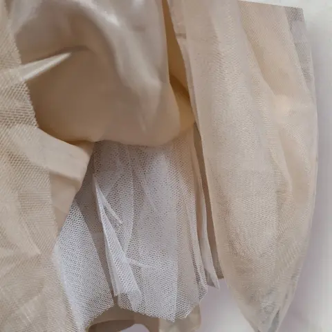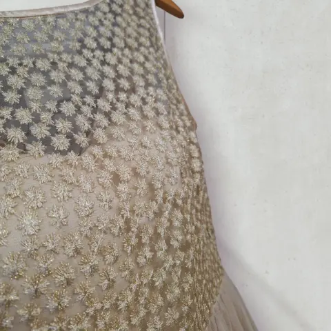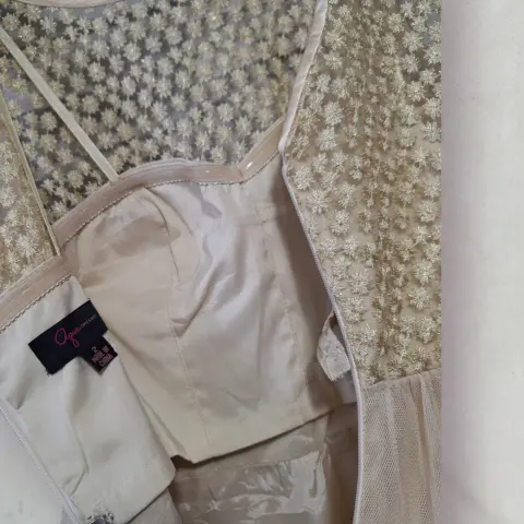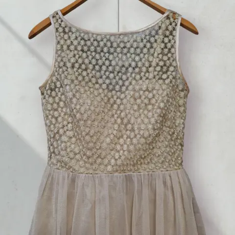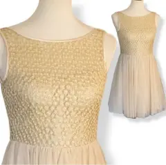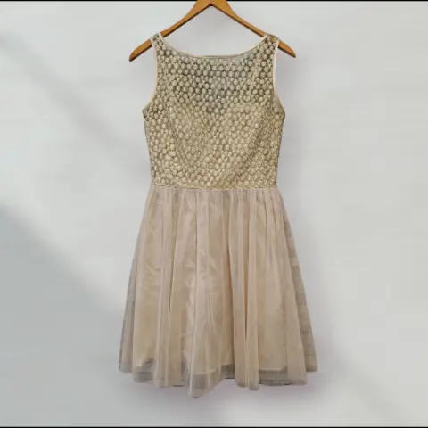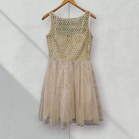 Vestido Beige Dorado con Transparencia, con Transparencia en pecho, encaje con acabado doradi, busto interno en forma de corazón, faldón con 3 capas, forro tu y gasa, en fotos la Transparencia se ve oscura pero es por el filtro pero es transparente como las 1ras fotos. talla S, no estira, medidas de axila a axila 40cm Cintura 35cm largo 82cm